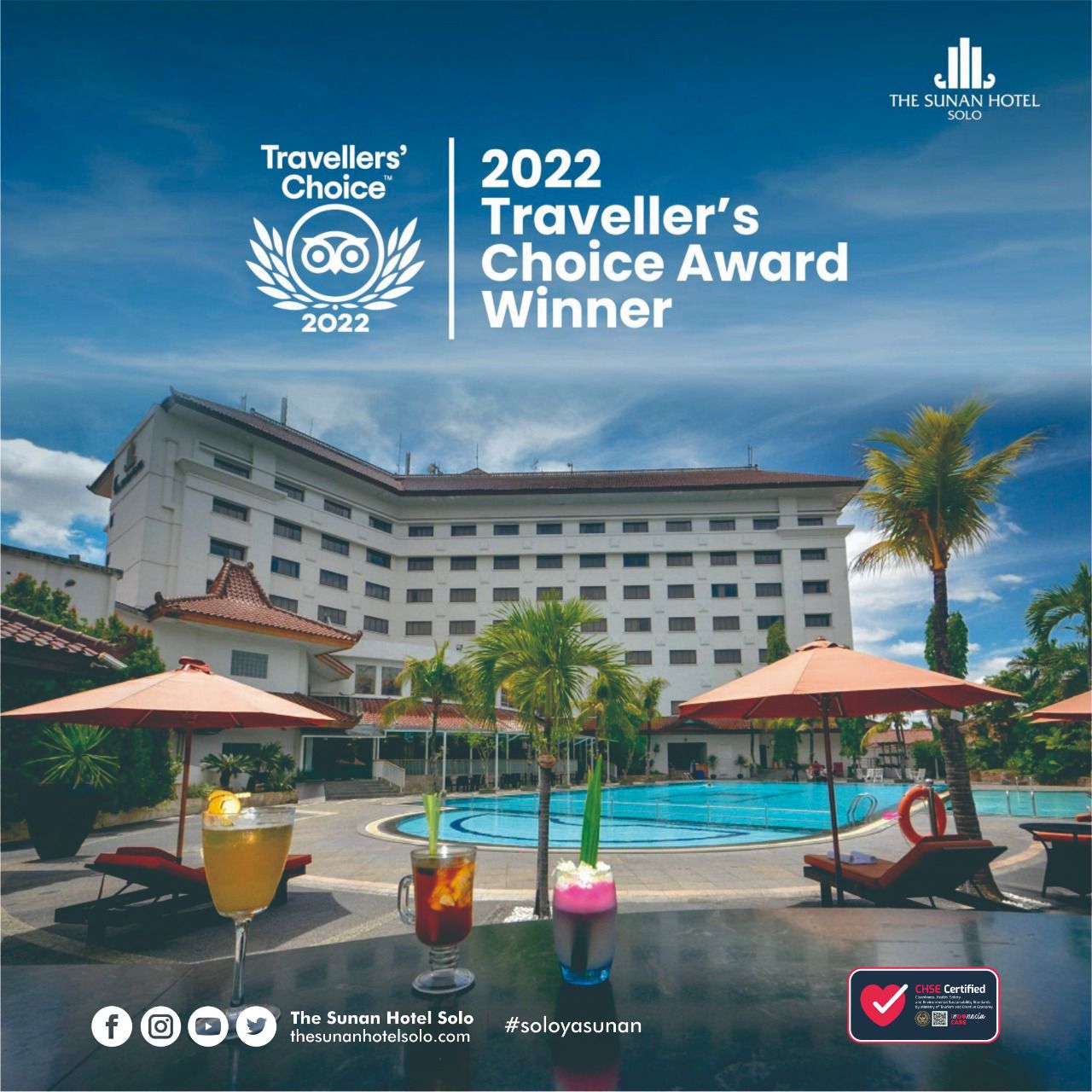 Di Tahun 2022 The Sunan Hotel Solo kembali meraih penghargaan prestisius “Travelers’ Choice Award 2022″ dari situs wisata terbesar di dunia Tripadvisor. Sebuah perusahaan travel online terkemuka.
